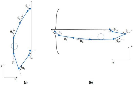 Marker placement and definitions of joint angles in the horizontal plane (a) and vertical plane (b). Positions are exaggerated to illustrate the definition of the joint angles. The positions shown here represent positive joint angles. The combined orientation of the 12 joint angles and positions of the acromion markers (which reflect the postural orientation of the lower limbs and the trunk) define the approximate orientation of the arrow in space (the exact orientation also depends on the bow geometry and where they hold the bow, but we assume the approximate and exact orientations to be fixed with respect to each other).