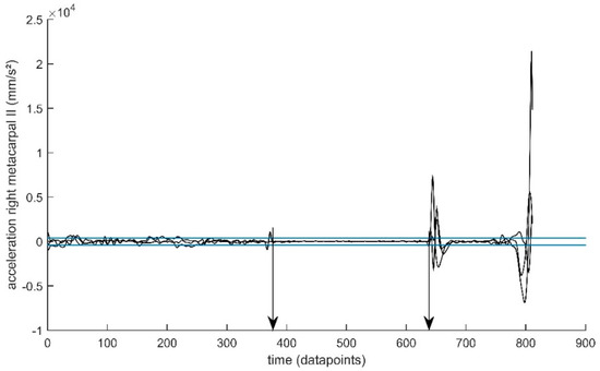 Time normalization of the aiming phase. When all components of the acceleration of the right-hand metacarpal II (black traces) remained between −400 and 400 mm/s2 (blue lines) for at least five consecutive time samples, the start of the aiming phase was defined (left vertical arrow), and release was defined when this condition was no longer met (right vertical arrow).
