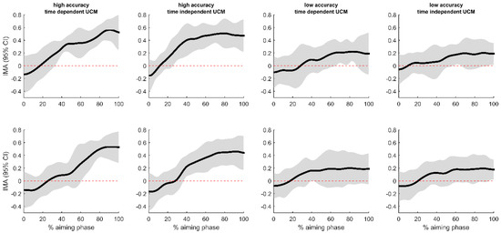 Figure 3 shows the mean and 95% confidence intervals (CIs) for the IMA time series for the six archers, calculated for the geometric models in both planes and using the time-(in)dependent means for the trials with high and low accuracies. The overall patterns of the IMA trajectories are similar, starting at negative values and subsequently increasing. In all conditions and for all subjects, the IMA eventually reached positive values and this remained until the end of the aiming phase. In the trials with high accuracy, the 95% CIs lay completely above zero from some point in the aiming phase, indicating structural covariations between the elemental variables to stabilize the arrow’s orientation (VUCM >> VORT). High-accuracy trials showed significant positive IMA values in the horizontal plane earlier in the aiming phase than for the vertical plane. The patterns appeared similar whether the Jacobean was linearized around the time-dependent or -independent means of the elemental variables. Additionally, for the trials with low accuracy, all subjects reached positive values, but these were smaller in magnitude, and the 95% CIs for the sample excluded zero only for brief parts of the aiming phase (VUCM ≈ VORT). For the time-independent UCM, the 95% CIs barely excluded zero at the last two points before release.