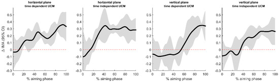 Figure 4 shows the results for the difference in IMA between high- and low-accuracy trials for both planes of motion and time-dependent and -independent means. The results corroborate the interpretation from Figure 3, specifically that the IMA is significantly higher for trials with high accuracy.