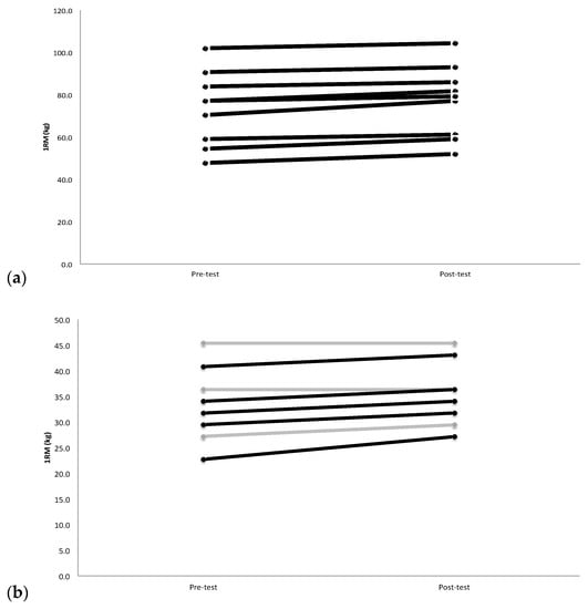 (a) Male individual changes in barbell bench press 1 repetition maximum (1RM), from pre-test to post-test. Black lines indicate an increase, where as the grey lines indicate a decrease or no change. n = 10; (b) Female individual changes in barbell bench press throw mean velocities (BTMV), from pre-test to post-test. Black lines indicate an increase, whereas the grey lines indicate a decrease or no change. n = 10.