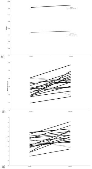 (a) Average overall changes in barbell bench press 1 repetition maximum (1RM), from pre-test to post-test. Males n = 10 (black line), Females n = 10 (grey line); (b) Individual changes in 1RM bench press barbell mean velocities (BPMV), from pre-test to post-test. Black lines indicate an increase, where as the grey lines indicate a decrease or no change. n = 20; (c) Individual changes in barbell bench press throw peak velocities (BTPV), from pre-test to post-test. Black lines indicate an increase, whereas the grey lines indicate a decrease or no change. n = 20.