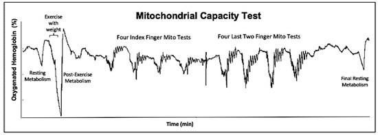 Changes in NIRS signals of oxyhemoglobin and deoxyhemoglobin during ischemic periods are used to measure the metabolism of oxygen in the muscle. The signals from the NIRS device create an exponential curve of recovery rates that give a time constant (Tc) to determine the oxidative capacity of the muscle [15]. In a mitochondrial capacity test, ischemic conditions create changes in the signal that is picked up by the NIRS device. Ischemia is induced by using a rapid cuff inflation protocol with the cuff placed proximal to the muscle that is evaluated. The cuff is inflated to 50–90 mmHg above systolic blood pressure in order to adequately occlude blood flow.