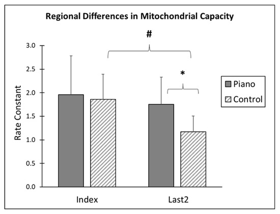 Regional differences in mitochondrial capacity. Control index Rc = 1.86 ± 0.5 and control last two Rc = 1.17 ± 0.3 (p = 0.001). The last two fingers in piano players showed Rc = 1.76 ± 0.6 and in controls Rc = 1.17 ± 0.3 (p = 0.01). A 2 × 2 analysis of variance (ANOVA) shows a significant difference between piano players and controls (F = 5.0, p = 0.039), and a significant difference between index and last two finger flexors (F = 12.8, p = 0.02). * and # denote significance.