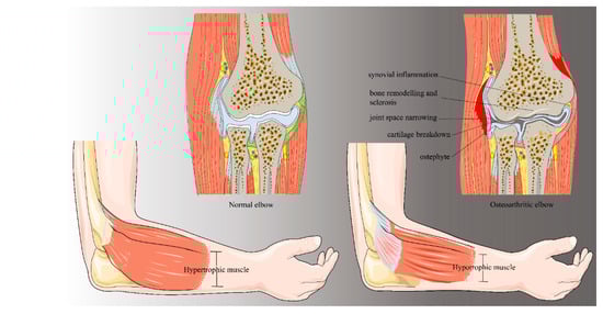 Osteoarthritis (OA) is one of the most important diseases associated with ageing, being rated as the 4th leading cause of chronic disability, which is diagnosed in around 40% of elderly people (over 60 years of age). It is the most common cause of joint replacement in developed societies, and its financial and social burden is likely to increase because of extending longevity and increasing levels of obesity [1]. A study conducted in 2016 estimated that the average total cost, worldwide, per knee osteoarthritic patient, is 11.1 k€ per year [2]. OA is often driven by an abnormal or injurious mechanical loading on the joint, but the exact mechanism behind senile articular changes which contribute to the process remains unclear [3]. Several hypotheses have been proposed, but it is more likely that more than a single factor play a part in the increased risk of articular degeneration with ageing. These include (i) repetitive mechanical micro-trauma over several decades, (ii) reduced muscle strength, leading to loss of joint protection during normal use, (iii) reduced autophagy and increased cellular senescence, (iv) reduced reparative response of the articular cartilage to injury, and (v) loss of surface lubrication leading to increased friction and damage [4]. OA causes changes in mobility and functionality, and patients commonly experience daily physical limitations like difficulties while performing working tasks or problems with housekeeping [5]. Distinct biological processes are to be considered crucial for the development of OA, and they are assumed to act in concert with additional risk factors to promote the appearance of the symptoms. The leading cause is attributable to an imbalance between anabolic and catabolic processes within the cartilage tissue, resulting in loss of structure and functionality of the whole articulation (Figure 1). OA progresses when cartilage degradation exceeds self-reparative processes [6]. In addition to trauma, other causes include overuse injury, osteochondritis dissecans, osteochondromatosis, crystal-induced arthropathies, and the sequelae of septic arthritis or haemophilia [7]. The biomechanical environment experienced by the joint needs to be taken into account when considering weight-bearing as a possible risk factor. Even though the elbow is not subjected to the same weight pressure of the knee joint, the articular cartilage on the upper extremity could undergo similar tensile stresses moving from a flexed to an extended position [8]. When elbow arthritis is not asymptomatic, it may be recognized by pain and impaired ability of movement. Joint narrowing is more commonly found in other joints rather than the elbow, while osteophytes presence and capsular contracture, with or without loose bodies, are very frequent [9]. Functional elbow range of motion (ROM), required for normal daily living activities, is considered to be an angle of motion of 100° (30° of extension to 130° of flexion) and a 100° angle of forearm rotation (50° of pronation to 50° of supination) [10]. Early stages of elbow OA are commonly treated without requiring surgical procedures. Operative treatment options, ranging from arthroscopy to open surgery, are performed to improve ROM and provide relief from pain by removing osteophytes and releasing of contracted soft tissue [11]. This review aims to investigate the current literature regarding the pathogenesis of primary and post-traumatic arthritis of the elbow. The principles of prevention and non-operative management will be presented, as well as indications for operative treatments.