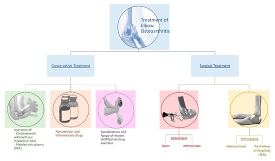 Treatment aims to reduce pain and improve articular function and global stability. During the early stages of elbow OA, physicians try to arrest or alleviate pain by instructing the patient on which type of movements need to be avoided, by prescribing nonsteroidal anti-inflammatory drugs (NSAIDs) such as aspirin and ibuprofen, and/or by acting on-site through intra-articular glucocorticoid injections and visco-supplementation. The latter has shown to exert limited effects in the elbow joint and still requires further studies to ascertain if it is genuinely beneficial and can provide long-term benefits [7]. To give an example, a study involving patients with post-traumatic OA showed that pain relief after visco-supplementation lasted for six months at the most [45]. Rehabilitation is a fundamental tool to slow down OA elbow deterioration. The primary goal of therapy should be to properly inform the patient about his/her symptoms and how to try to control them, reducing the pain and preserving the wellness of the elbow. However, beneficial changes in routine activities can be problematic for physically active athletes [27]. In fact, in order to limit the pain and reduce inflammation, the patient could be asked to reduce movements. An elbow splint can be suggested to immobilize and protect the elbow [11]. Range-of-motion (ROM) and stretching exercises should be started at the earliest pathological signs. These exercises can improve elbow flexibility, increase stability and protect the joint from mechanical stress [46]. Rehabilitation processes need to involve specific exercises also for hip stability, core muscles and scapula, shoulder and hand. The patient will follow-up with a home program within four to six weeks [47]. A joint protection plan is thought to help the patient to perform activities of daily living (ADLs), aiming to control pain, minimize further joint deterioration, and preserve energy [48]. It is also essential to prevent non-physiological positions and maintain balance during weight lifting. Night splints could also help to protect the elbow during sleeping hours [19]. The primary purpose of treatment, especially in young patients, is to achieve minimal pain and to retain proper articular functioning while preserving the joint from future surgical interventions and delaying arthroplasty for as long as possible [49].