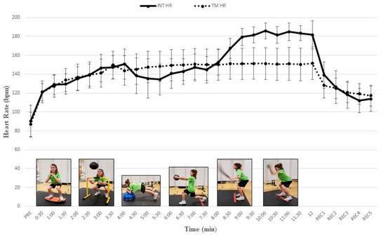 Heart rate (HR) responses (mean ± SD) during integrative neuromuscular training (INT) and treadmill (TM) protocols. PRE = Baseline; REC = recovery. See Table 1 for significant differences between INT exercises and protocols.