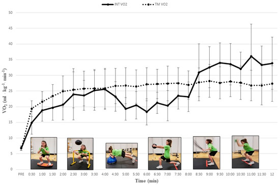The aim of our study was to examine the acute cardiometabolic responses to a multi-modal INT protocol in children and to compare these responses to a bout of moderate-intensity TM walking. Consistent with our hypothesis, we found a progressive, multi-modal INT protocol comprising 30 s of work with 30 s of passive recovery can pose a moderate to vigorous cardiometabolic stimulus in children and selected INT exercises can be equal to or more metabolically challenging than TM walking. While other pediatric investigations detailed the acute physiological responses to intermittent bouts of single-mode exercise with cycling, sprinting, medicine balls or battling ropes [14,15,30,31], this is the first study to describe the acute cardiometabolic demands of a mixed-exercise INT protocol in children. No significant differences were observed in mean VO2 between the entire 12-min INT and TM protocols. However, mean HR, VE, and RER were significantly higher during INT than TM. Given the link between vigorous physical activity and positive health outcomes in youth [17,18,19], our findings provide insight into the potential cardiometabolic benefits of INT if performed at the requisite weekly frequency.
