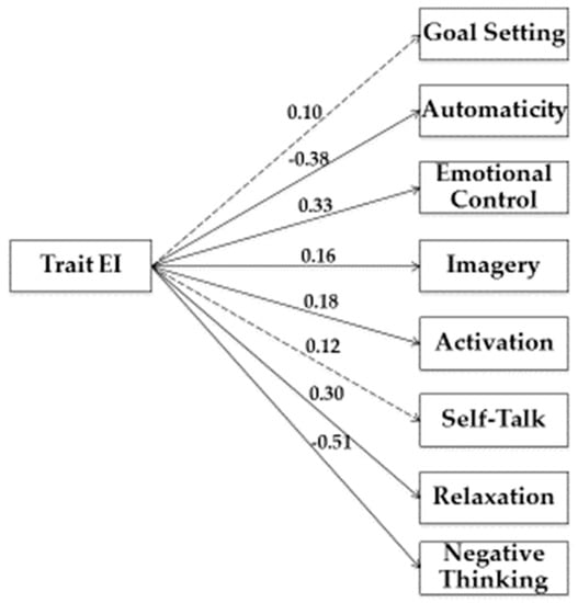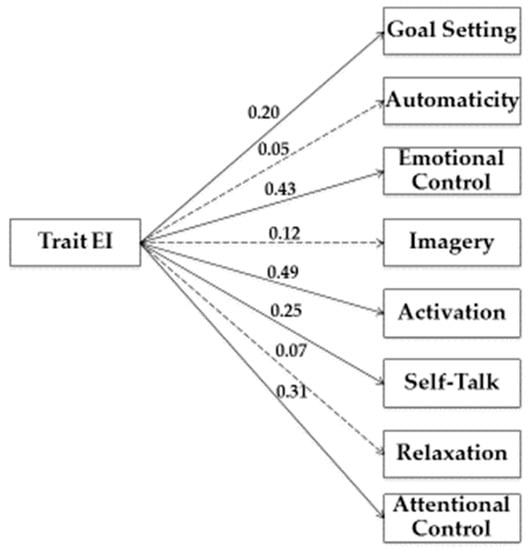 Estimation of the saturated model (no fit indices were reported) showed a significant path from trait EI to Goal Setting (β = 0.20; p < 0.05), Emotional Control (β = 0.43; p < 0.05), Activation (β = 0.49; p < 0.05), Self-Talk (β = 0.25; p < 0.05), and Attentional Control (β = 0.31; p < 0.05).