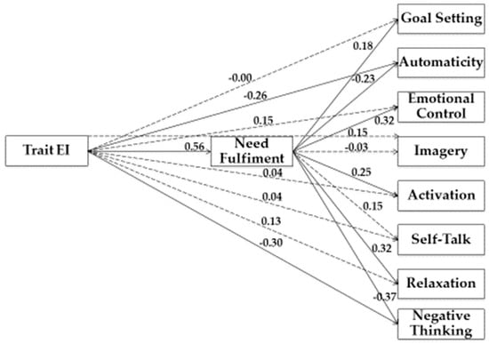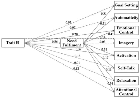 Furthermore, there was a statistically significant direct association between Trait EI and Need (β = 0.56; p < 0.001), Emotional Control (β = 0.20; p < 0.01), and Activation (β = 0.32; p < 0.001). Moreover, there was a statistically significant direct association between Need and Goal Setting (β = 0.31; p < 0.001), Automaticity (β = 0.21; p < 0.01), Emotional Control (β = 0.41; p < 0.001), Activation (β = 0.31; p < 0.001), Self-Talk (β = 0.17; p = 0.04), and Attentional Control (β = 0.34; p < 0.001).