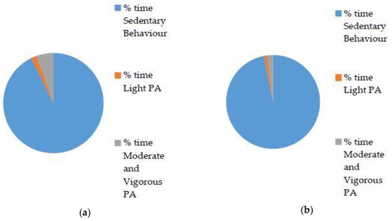Figure 1. Percentage (%) daily time spent in different intensities of physical activity. (a) Weekdays and (b) weekends for 178 preschool children.