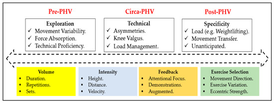 As provided in Figure 1, there are a number of approaches that can be proposed to develop force absorption ability throughout youth that should consider aspects of exercise volume, intensity, movement exploration and complexity. For example, the inclusion of activities such as parkour (Exploration) earlier in the child’s development may a provide varied and diversified training programme [213] that provides individuals with the opportunity to sample different movements to manage forces [214,215]. Previously, it has been revealed that parkour participants are more effective at lowering the kinetic landing variables that are associated with a higher injury risk in comparison to recreationally trained individuals [216]. An approach that promotes movement exploration may be helpful in reducing future injury risk due to issues surrounding sport-specialized youth athletes landing biomechanics [217] and the reported anterior knee pain disorders compared to multi-sport athletes [218]. As the individual reaches PHV, further progressions could be included by integrating exercises that have a unilateral landing (Technical) focus in order to aid in the reduction of any asymmetries that may occur during this stage of maturation [188,219,220]. During this stage, increasing the complexity of the jump-landing can be achieved via increasing the jump velocity (intensity) which will subsequently challenge landing kinematics via achieving a greater jump height [221]. The inclusion of weightlifting derivatives (Specificity), which have been advocated previously in youth [222,223], could also be included, more specifically at the post-PHV period. Inclusion of weightlifting derivatives, such as the jump shrug, hang power clean and hang high pull, can be also used to improve load absorption characteristics [224,225]. Such an approach would further challenge movement complexity as well as developing concentric neuromuscular power during the propulsive phase of the movement and eccentric force qualities during the landing phase. Based upon previous recommendations to reduce injury risk in youth [226], we would suggest an approach based on participants’ maturation status, exercise variations (variations), utilisation of verbal feedback (feedback) and, finally, exercise dosage (volume). Although limited information exists pertaining to the use of training volumes for landing mechanics in youth, it has been shown that sessions including up to six sets of six repetitions when completing the drop landing exercise have improved landing kinematics in adults [227]. As a result, it may be sensible to build training volume towards this level throughout the stages of youth. This may be achieved via varied exercise selection [226] with a frequency of two to three times per week which has been suggested for plyometric exercises in this population [228].