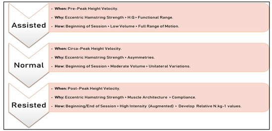 Concerns regarding the inclusion of ERT at earlier stages in youth should have been alleviated by the information provided in Section 1 of this article. This is also supported by evidence that increases in hamstrings strength have been shown in basketball players aged 10–12 years following a five-week NHE programme [266]. However, as per previous recommendations, we would also suggest that the NHE should form part of a holistic hamstrings programme [267]. Therefore, although we feel that the inclusion of the NHE in youth should be viewed as a fundamental exercise used to increase eccentric hamstrings strength, other eccentric hamstrings exercises that target both distal and proximal hamstrings regions should be integrated [239] as well as inclusions of concentric [268], isometric [269] and sprinting [270] exercises. These should be completed with correct technique, appropriate progressions and in accordance with current RT guidelines for youth. Additionally, an emphasis during youth should be placed upon developing eccentric hamstrings strength across its full ROM due to the proposition that a shift in the optimum angle of peak torque provided by performing eccentric hamstrings exercises at long muscle lengths reduces hamstrings injury risk [58,271]. Moreover, both male and female senior players possess higher angle specific torque and functional range eccentric knee flexor values compared to their respective youth counterparts [272,273]. Ensuring that exercises target the full range of movement may also aid in the development of the hamstrings muscle architectural properties. This may be because shorter biceps femoris fascicle lengths can increase hamstrings injuries [274]. Considering the positive effects of eccentric exercise on properties such as fascicle length [54,271,274,275,276,277,278,279,280,281,282], as well as the relatively quick reversal of hamstrings muscle fascicle length and strength adaptations [278,279,280], perhaps the regular and structured inclusion of eccentric hamstrings exercises throughout youth could be viewed as a preparatory approach to developing architectural properties of the hamstrings and a foundation of eccentric hamstrings strength that can be maintained and progressed at senior levels. This is because it has been proposed that increases in fascicle length typically occur during the pre-pubescent period, whereas substantial increases in muscle cross-sectional area (CSA) typically occur during the pubescent period [283,284]. As a result, it may be advisable to develop structural properties and strength qualities earlier on in youth via the progression of training volume prior to increasing the intensity of the exercise post-PHV, once sufficient absolute and relative eccentric hamstrings strength has been achieved [285]. Indeed, it has been reported that additional loads are required during exercises such as the NHE in order to promote further eccentric hamstrings strength increases and fascicle length [286]. Subsequently, increases in muscle architecture properties at post-PHV status may also be targeted via performing the NHE either pre or post training to elicit specific morphological adaptations [287].