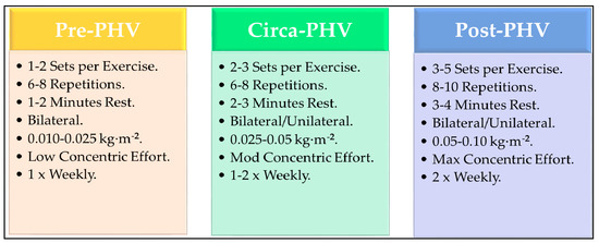 Considering that physical qualities, such as COD, speed and strength, are recommended to be developed throughout all stages of youth [6] as well as the aforementioned benefits of FIT, its implementation within youth may be beneficial. This is appealing since the magnitude of eccentric forces encountered by a flywheel device during an exercise is proportionate to the preceding concentric forces [325]. Such an approach may be appropriate in youth as their lower concentric force capability would result in eccentric forces that would be proportionately lower [326]. In addition, it has been demonstrated that the use of higher flywheel inertias can concomitantly provide eccentric overload via increases of kinetic variables such as negative impulse during the descent phase of a movement [292,327,328]. Therefore, the introduction of low intensity flywheel inertia wheels may represent an appropriate starting point for training progressions along with lower training volumes prior to gradually increasing the load, volume and frequency to that which has been currently reported for FIT in adult populations [25,35,292,302,305] and which reflects current youth resistance training guidelines [17]. Such an approach is provided in Figure 3. Furthermore, since muscle damage following FIT have been shown to reflect those routinely reported following eccentric exercise [329], it important that as the individual reaches post-PHV the inclusion of eccentric overload training within the micro-cycle is further carefully deliberated. The potential greater increases in concentric force production during FIT that would be expected as a product of growth, maturation and training exposure will subsequently result in higher eccentric overload too, which may subsequently heighten fatigue and muscle damage responses that are observed in adults.
