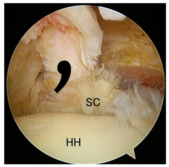 Tears of the subscapularis tendon are less common than those of the posterosuperior rotator cuff muscles (supraspinatus and infraspinatus). The prevalence of subscapularis tendon tears had been largely underestimated before arthroscopic examination became popular in the 2000s. Currently, the diagnosis of full-thickness subscapularis tear is routinely made arthroscopically and with reliable accuracy, with reporting tear-rate up to 29% [4,5,6]. In most cases of a full-thickness subscapular tear, the torn tendon retracts medially and inferiorly; however, as the superior glenohumeral ligament and coracohumeral ligament are attached to the subscapularis, it assumes a comma shape (so-called “comma sign”), which is thought to be pathognomonic of a subscapularis tear (Figure 1) [7].