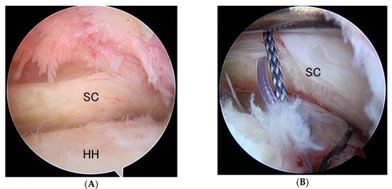 Floating subscapularis. (A) Rt. shoulder viewing from the posterior portal. Subscapularis is detached from the lesser tuberosity but is not retracted. The comma structure is preserved and the subscapularis is appearing to be normal at a glance. (B) Internal rotation of the shoulder discloses the detachment of the subscapularis from the lesser tuberosity. A suture anchor is inserted on the lesser tuberosity and sutures are applied on the torn subscapularis. SC: subscapularis, HH: humeral head.