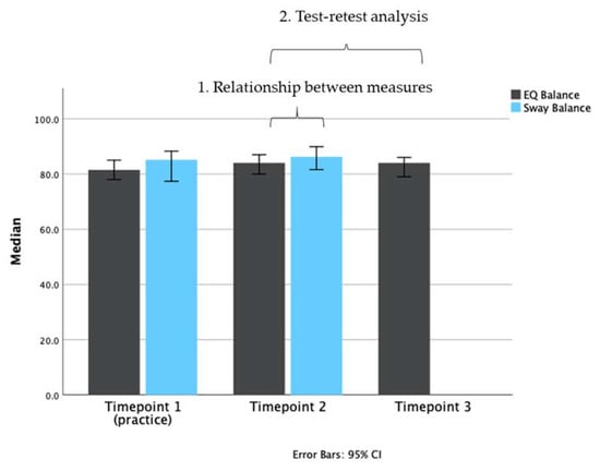 Bar plot representing the median scores of each test (EQ Balance, gray bars; Sway Balance, blue bars) at different time points. Timepoint 1 (T1) was used as a practice/acclimatization session. Timepoint 2 (T2) was the main test session. Timepoint 3 (T3) was used in the test-retest analysis for EQ Balance. Data are plotted as medians with 95% confidence intervals.