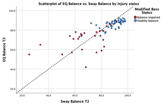 Relationship between the scores on the Sway Balance task and the EQ Balance task. Data points are differentially identified by balance impairment as measured by the mBESS (blue = pass, red = fail). Unity line Y = X is shown as a black dotted line.