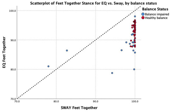 By observation, this analysis identifies tight clustering of individuals both with and without concussion whose balance deficits are relatively low (i.e., those with scores > 80.0). Greater dispersion is observed with those from both groups with apparent balance deficits; however, these data maintain a strong correlation: running a correlation analysis on the subgroup of participants with an EQ result below 80 found the Spearman’s correlation coefficient, rho = 0.86 (p < 0.001) between measures in this group.