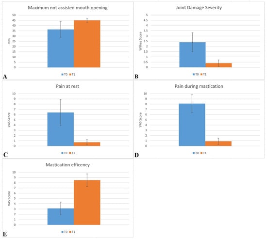 Graphical representation of collected data at baseline (T0) and 6 months follow-up (T1). (A) Maximum non-assisted mouth opening in mm. (B) Joint damage severity expressed in Wilkes Score. (C) Pain at rest expressed in the Visual Analogic Scale (VAS) Score. (D) Pain during mastication expressed in VAS Score. (E) Masticatory efficiency expressed in VAS Score.