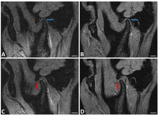 Right TMJ MRI in sagittal plane of patient with the jaw closed at T0 (A) and T1 (B) and open at T0 (C) and T1 (D). Increased disk and cartilage thickness (blue arrows) and increased excursion of mandibular condyle (red arrows) were observed. BAR = 1 cm