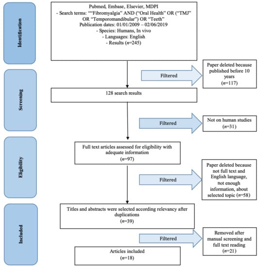 The search was conducted on search engines, according to the previous paragraph. It was conducted several times, making sure not to get errors due to software processing. The keywords used are the following: “fibromyalgia” AND “oral health” OR “TMJ” OR “temporomandibular” OR “teeth”. Search keywords have been chosen so as to limit the number of errors and increase the number of results. The main question is: