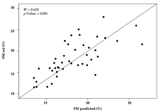The scatter plot illustrates the results of the regression analysis for FM% obtained by the reference method (DXA) and predicted by the equation developed in the sample of international soccer referees.