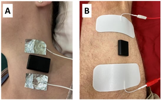 Muscle endurance was measured using a 5 min stimulation protocol, similar to a previously published nine-minute endurance protocol [,,,,]. Custom-made foil electrodes were placed on the neck and ultrasound gel was placed underneath the electrodes. The electrodes were cut to fit the approximate width of the muscles being tested. The electrodes were additionally held in place with surgical tape. A tri-axial accelerometer (Axivity-AX3, Newcastle Upon Tyne, UK) was placed in between the two foil electrodes with double-sided tape. The accelerometer was set at ±2 g, with 13-bit resolution, and 400 Hz sampling rate. For the VL testing, two gel electrodes were placed across the VL and an accelerometer was placed in between the two electrodes with double-sided tape (Figure 1).