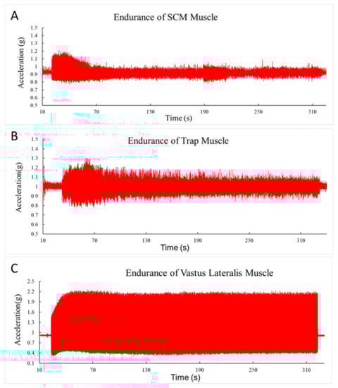 Assessment of muscle endurance using involuntary twitch contractions involves measuring changes in muscle acceleration of the twitch contractions over a given time. This approach has been used to characterize muscle endurance in various human muscles [,,]. The present study evaluated specific muscle endurance using twitch contractions and accelerometry in two muscles located in the neck; the SCM and the trap muscles, and compared them to the vastus lateralis (VL) muscle in the leg.