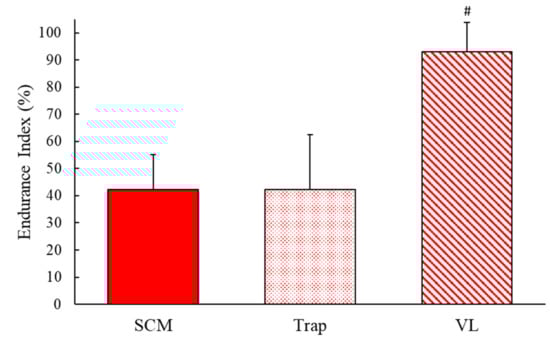 The endurance index mean and standard deviation of the sternocleidomastoid, trapezius, and vastus lateralis muscles. # shows a significant difference from both SCM and trap, p < 0.05.