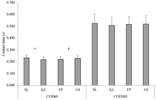Mean ± SD of contact time for the change of direction tests. COD60: 60° change of direction; COD180: 180° change of direction; SL: stance leg; KL: kicking leg; FP: force plate; OJ: Optojump system. * Main effect of leg (p < 0.001). # Main effect of device (p < 0.001).