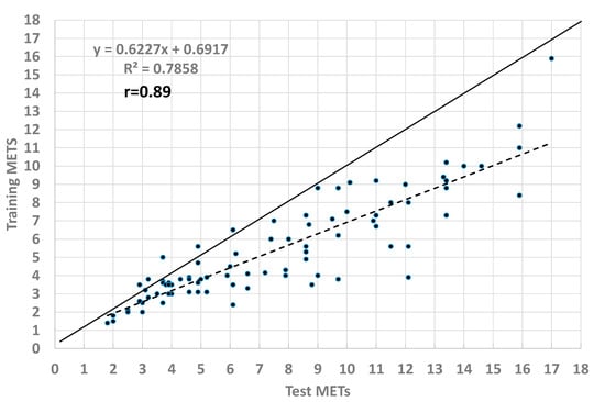 In this paper, we have taken the strategy of trying to “generalize” the magnitude of step down, by computing the relative workload, expressed as METs, on the basis of standard metabolic formulas [] during both exercise testing and training, based on our previously published data [,,,,,,]. We then plotted the METs during the exercise test against the METs during the steady state period (15–30 min) during exercise training, with the same magnitude of homeostatic disturbance in terms of % HRR, Talk Test score, and RPE. The results of this comparison are presented in Figure 1. The translated MET values were well correlated (r = 0.89) and the mean “step down” followed a linear regression, with an average step-down to 71.8% from testing (7.66 ± 4.03 METs) to training (5.50 ± 2.92 METs). This strategy, of course, is primarily designed for near steady state training sessions. In principle it could be extrapolated to interval training, although factors such as the length of the hard and easy segments, as well as the difference between hard and easy segments would have to be considered. Accordingly, the purpose of this study was to develop a ‘generalized model’ for translating exercise test responses to exercise prescription.
