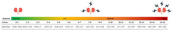 Despite kidneys being well protected by abdominal and back muscles, ribs, fat, renal pedicle, and ureteropelvic junction and supporting Gerota fascia in the retroperitoneum, they are also susceptible to internal movements [,]. Repeated sudden accelerations and decelerations may lead to renal contusions caused by the collision of kidneys in its surrounding tissues and structures like spine and ribs. These actions could lead to renal vasculatures affections, nephron damage, consequent hematuria, and other blood markers findings [,,]. These accelerations and deceleration could be assessed using the variable impacts as proposed in this study. The impacts between 5–7 g explained the pre-post increase of sALB and the impacts of 1–2 g and 14–15 g explained the rise in sCr. Based on the literature [], these results may suggest that both the volume and intensity of the impacts involved during renal contusions play a special role in acute kidney injury. It has been found that the ∆% of blood markers as serum creatine kinase and sCr could predict the external workload of wearable devices placed in L1–L3 by 40% and 27%, respectively []. This evidence supports the idea of a new hypothesis of mechanical kidney injury during endurance off-road running based on L1–L3 external workload data [].