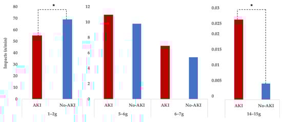In follow up to the abovementioned PCA results, those participants that met AKI diagnosis criteria (33.3% of participants) registered lower number of impacts in the 1–2 g category (t = −2.42, p = 0.03, d = −1.45, large effect size) but higher number of impacts in the 14–15 g category (t = −3.1, p = 0.01, d = −1.58, large effect size) (see Figure 4.). No differences we found in the 5–6 g or 6–7 g categories.