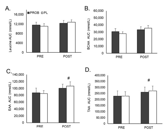 Area under the curve (AUC) values for plasma leucine (A), branched-chain amino acids (BCAAs; B), essential amino acids (EAAs; C), and total amino acids (TAAs; D) from 0–120 min following consumption of 25 g of whey protein before (PRE) and after (POST) a 28-day supplement intervention. Groups: PROB: Bacillus subtilis DE111; PL: placebo. # main effect observed with higher values at POST. Values represent means ± SEMs.