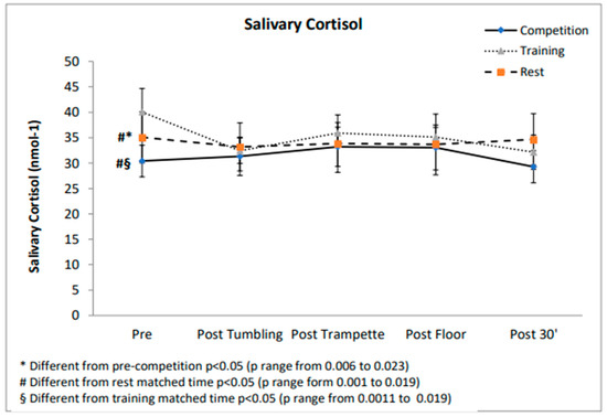 Competition is a stressful situation, which stimulates high psychophysiological responses in athletes [2,21]. The present findings not only provide valuable information on the difference in temporary changes in stress-related parameters during real competition and training but also give indications on the chronic changes that occur after intensive training in well-trained gymnasts. Moreover, higher stress-related responses during competitions have been shown to be related to higher penalties during TeamGym [2], and this occurrence could potentially increase the risk of injuries. Quantifying the psychophysiological response to exercise can provide a wealth of information in planning a progressive adaptation during training to the high demands of competition and may provide another tool to help enhance athletes’ performance. As the small sample size, this study can be considered only a preliminary investigation: in the future, in order to be complete, more information regarding psychophysiological load (i.e., heart rate and blood lactate responses), mood changes [14] and anxiety [2] before training and competition could help coaches and physicians to individualize training and avoid non-functional overreaching.