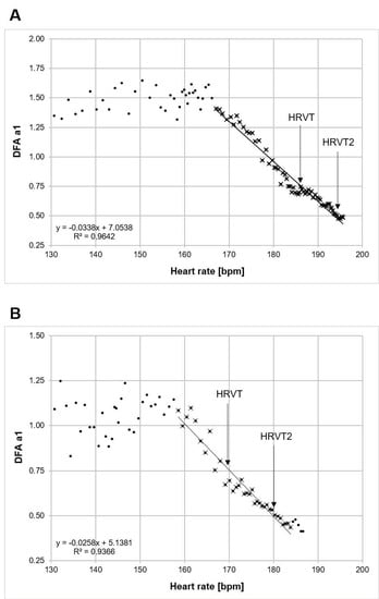 Individual examples of calculation methods for both HRVT and HRVT2. A line is drawn through the straight section of the plot of DFA a1 vs. HR. HRVT is at the intersection of DFA a1 = 0.75 and HRVT2 is at the intersection of DFA a1 = 0.5. (A) Participant with a VO2MAX of 72 mL/kg/min, VT2 at 192 bpm and HRVT2 at 194 bpm. (B) Participant with a VO2MAX of 58 mL/kg/min, VT2 at 179 bpm and HRVT2 at 180 bpm. Points with X are used for linear regression.