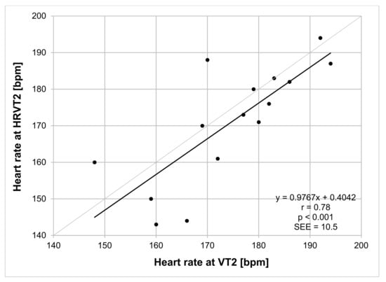 Regression plot analysis VT2 HR vs. HRVT2 HR for all participants. Bisection line in light gray. SEE: standard error of estimate; r: Pearson’s correlation coefficient.