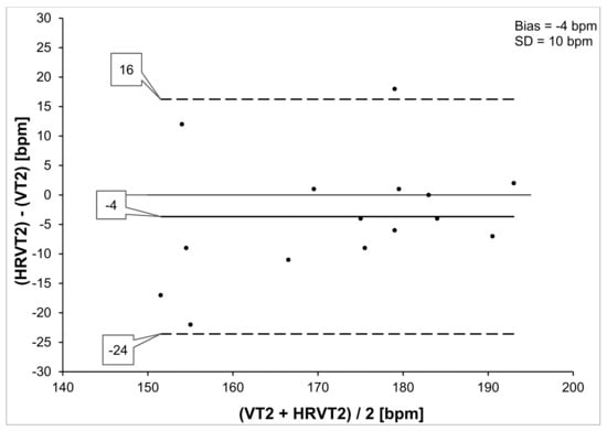 VO2MAX varied considerably among participants, ranging between 41 and 74 mL/kg/min. VT1 was reached at HRs between 108 and 183 bpm [27]. Oxynet-derived HR at VT2 showed a mean value of 174 (±12) bpm compared with a mean HRVT2 HR of 171 (±16) bpm (p = 0.18) for all participants (Table 1). Regression analysis for VT2 HR vs. HRVT2 HR showed significant correlation (p < 0.001) with Pearson’s r = 0.78, R2 = 0.60 and SEE = 10.5 bpm (Figure 2). Bland–Altman evaluation of VT2 HR vs. HRVT2 HR is shown in Figure 3 with a mean bias of −4 (±10) bpm and LOA from −24 to +16 bpm.