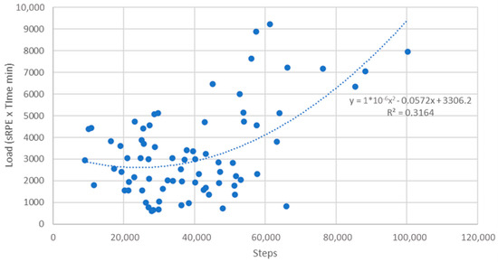 Figure 1 represents the relationship between total weekly steps and sRPE derived training load, with each week per subject being presented as a data point. The curvilinear line of best fit indicates that as step count increases there is an increase in sRPE derived training load. This graph shows that the majority of weekly averages are less than 60,000 steps and less than 5000 AU load. It also illustrates that a step counts <50,000 per week, there is relatively little change in sRPE based training load, probably because many of the steps were representative of activities of daily living, rather than structured exercise.