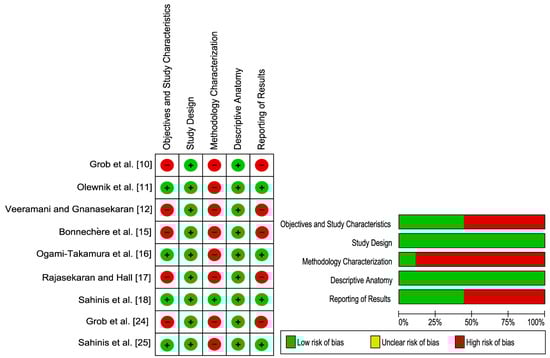 The AQUA tool was used by the reviewers to assess the quality and reliability of the included studies [23]. The AQUA tool probes for the potential risk of bias in five study domains, namely, (1) objectives and subject characteristics, (2) study design, (3) methodology characterization, (4) descriptive anatomy, and (5) reporting of results. The risk of bias within each domain is normally categorized as “Low”,” High”, or “Unclear”. If at least one of the signaling questions within each of the domains was answered with “No”, the reviewers arbitrated the domain to be of “High” risk of bias, while if all questions was answered with “Yes” then that domain is assigned to a “Low” risk of bias. For questions that could not be answered due to unreported or insufficient information, the risk of bias was defined as “High”.
