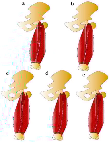 Anatomy of TVI musculature has been detailed described by five cadaveric studies [10,11,12,15,16]. The TVI was mostly identified in the anterior compartment of the thigh as a clearly separate muscle belly between VL and VI musculatures [10,12]. The morphology of the TVI presented great variability and sometimes differed in morphology between individuals and body sides [11,15]. Proximally, the TVI arises from the anteroinferior aspect of the greater trochanter of the femur distal to the intertrochanteric line and it is covered by RF [10,12]. In some cases, more complex anatomy has been reported including a similar origin with other muscles such as VL, VI and gluteus minimus (rarely) as well as an origin with multiple heads with one or more tendons [11]. Medially, TVI has a broad and flat aponeurosis that is separable, while in some cases is hardly distinguishable from VI and/or VL aponeuroses [10]. Distally, the aponeurosis forms a tendinous structure that takes an oblique course and attaches to the upper medial aspect of patella and it fuses with either the VL, VI, RF, or a combination of two or all three aponeuroses [10,12]. A schematic representation of the most frequent course of the TVI musculature in relation to the surrounding muscles is depicted in Figure 4.