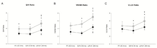 - Palmieri-Smith, R.M.; McLean, S.G.; Ashton-Miller, J.; Wojtys, E.M. Association of Quadriceps and Hamstrings Cocontraction Patterns with Knee Joint Loading. J. Athl. Train. 2009, 44, 256–263. [Google Scholar] [CrossRef] [PubMed]
