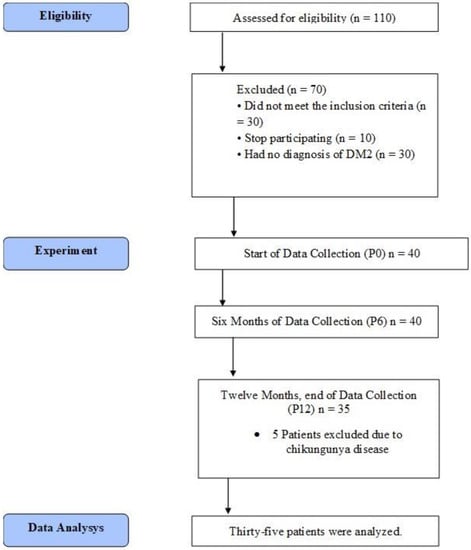 A longitudinal, paired clinical study, with a quasi-experimental characteristic, was performed in a period of 12 months. One hundred and ten women from the gynecology outpatient clinic, who were already postmenopausal and diagnosed with T2D, were recruited to participate in the study. After the invitation, the following exclusion criteria were applied: neurological problems that compromise balance and gait; patients who were supplementing with a dose of more than 1000 u/d of vitamin D (all types) continuously for more than three months; cognitive deficits, deformities in the upper and lower limbs, severe vision problems, dizziness symptoms, severe hearing loss, uncontrolled arterial hypertension, and postural hypotension, use of balance-compromising drugs (sedatives and anticonvulsants); excessive use of alcohol; obesity Grade III, liver diseases and nephropathies, use of glucocorticoids, antiretroviral medication for HIV, hyperparathyroidism, hypercalcemia, lymphomas, granulomatous diseases, current neoplasm. The initial group for the study was 40 participants at the end of the recruitment and consent (Table 1).