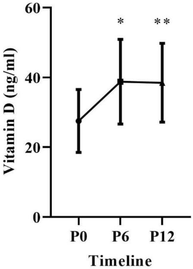 In the comparisons of repeated measurements (P0 vs. P6 vs. P12), the ANOVA results demonstrated patients had significant increases in vitamin D (p = 0.0001). In the multiple comparisons, there were gains between the measurements of P0 (27.5 ± 9.0; Limit) vs. P6 (38.8 ± 12.1; Acceptable); p = 0.0001 and a percentage increase of 48.39% (11.55 ng/mL), P0 (27.5 ± 9.0; Limit) vs. P12 (38.5 ± 11.3; Acceptable); p = 0.0001 and a percentage increase of 32.35% (6.14 ng/mL) (Figure 2).
