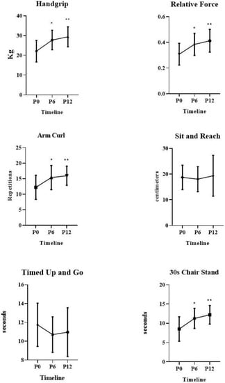 In repeated measures comparisons (P0 vs. P6 vs. P12), the ANOVA results demonstrated the patients had significant changes in the following variables: handgrip strength (p = 0.0001), relative strength (p = 0.0001), arm curl test (p = 0.0002), and 30 s chair stand (p = 0.0001). Additionally, there were no differences in the following variables: timed up and go (p = 0.107), sit and reach (p = 0.625).