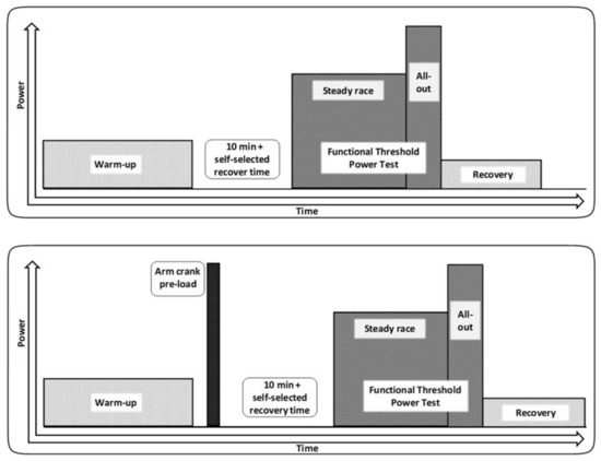 Functional threshold power (FTP) is a frequently used additionally important performance quality indicator [21] which is highly correlated to mLSS [21] and relative power exertion during a mass-start bike race [22]. It is the maximum mean power, which can be sustained for an approximately 1 h period and is a good predictor of overall performance capacity [21]. Denham and colleagues [21] found that FTP can be evaluated by a time efficient 20 min FTP test (FTP20), which predominantly relies on aerobic metabolism [21]. Considering previous suggestions to test upper-body high-intensity pre-loading on more aerobic distances [10], we decided to use FTP20 to be as cycling-specific as possible for our evaluation method.