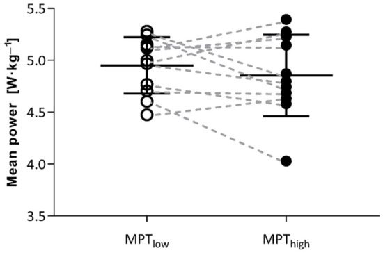 Correlation analysis showed that MPTlow was correlated with variables from the incremental tests such as V˙O2max (mL·kg−1·min−1), maximal relative power (W·kg−1), and 10% Δ VT2 for the first 17 min. Since MPThigh did not correlate with any of these values, it is suggested that performance becomes less predictable after priming exercise and can easily diminish previous training. However, many studies [7,19,20,29] have shown the physiological advantages of priming, although they cannot guarantee any improved results during an actual race [30]. In this case, we still suggest pre-load to have beneficial effects, which are highly individual and rather empirical methods are needed to distinguish such effects in every single athlete. For example, four participants (26.7%) benefited from the priming and developed higher mean power during last 3 min of the final spurt in our study. A possible explanation for this might be the neuromuscular excitability, which was induced on central level, since priming was performed with non-primary muscle groups. However, previous studies prescribed neuromuscular potentiation mainly to single repetition or sprint exercise, but endurance sport on submaximal level is not common [3].