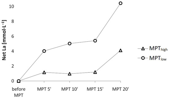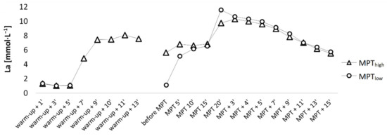 Blood [La] concentration (EKF-Diagnostic; Barleben, Germany) was determined for both conditions at rest (baseline), after the warm-up (immediately after, + 3′, + 5′), after the anaerobic priming load (immediately after, + 3′, + 4′, + 5′, + 7′), during the test (immediately before, + 5′, + 10′, + 15′), and during recovery (immediately after MPT, + 3′, + 4′, + 5′, + 7′, + 9′, + 11′, + 13′, + 15′) (total of 21 samples in MPThigh and 16 in MPTlow protocol). Arterialised blood samples (20 μL) were taken from a pre-warmed fingertip. The finger was always cleansed with alcohol, and the first drop of blood was removed to prevent contamination of the sample. At the same time as the [La] measurements, participants were asked to evaluate their overall and muscle fatigue using the 20-point Borg scale [23].
