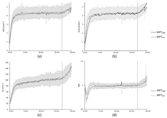 V˙CO2 values were not different at the start between MPThigh with 0.53 ± 0.11 L·min−1 compared to 0.53 ± 0.13 L·min−1 in MPTlow (p = 0.96; d = 0.02) and the between-group effect was insignificant (p = 0.15; η2 = 0.15) throughout the test. RER values demonstrated a steady-state (Figure 4) from minutes 10 to 17 of the maximal performance up to the final spurt and reached its peak by the end of performance with no significant between-group effect (p = 0.39; η2 = 0.10). A visualisation of spirometric values shown in Figure 5.